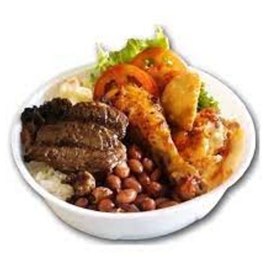 BAIÃO DE DOIS SOLTO, ARROZ REFOGADO, FEIJÃO CARIOCA, MACARRAO, FAROFA, BATATA DOCE E SALADA DE MACAXEIRA COM MAIONESE OU SALADA DE REPOLHO E TOMATE, DOIS TIPOS DE CARNES.